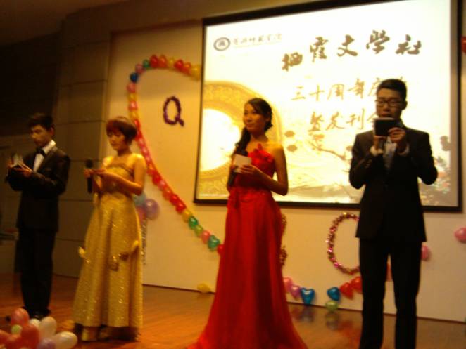 庆典在柔美的歌舞中拉开序幕,胡院长提出“文学是人生的追求,它让你在生活中保持一种浪漫”,并对栖霞文学社三十年来的累累硕果表示肯定,对栖霞文学社未来发展寄予希望。余书记饱含深情地回顾了《栖霞》的历史,“因为坚守,创造栖霞辉煌”,对《栖霞》传承与创新提出了新的要求;夏教授号召栖霞文学社广泛团结爱好文学者,让更多的高年级同学能够参与进来。随后,一首真情流露的《栖霞颂》以及“栖霞,我有话对你说”为主题的纪录片都表达了社员们对《栖霞》的深深爱恋,更是借此向《栖霞》说声生日快乐。“学到该学的,给我们能给的”是《栖霞》社长的一句话,更是《栖霞》每个成员的宗旨。