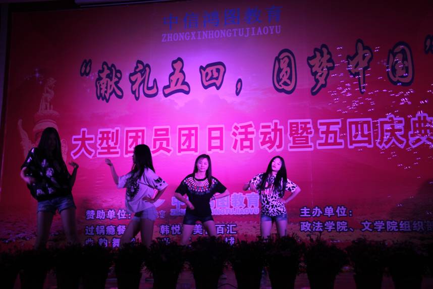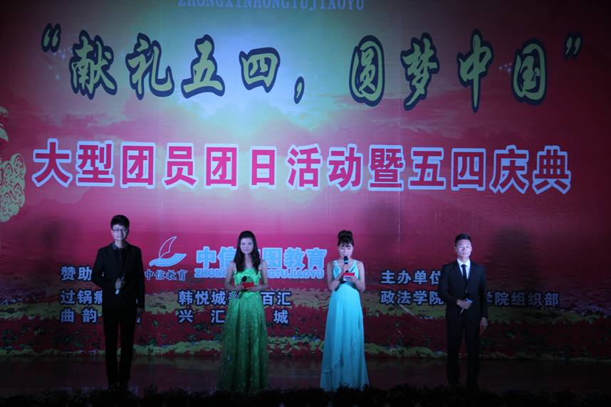 此次庆典活动以“献礼五四,圆梦中国”为主题。两院长时间精心筹备。晚会中表演的节目类型多样,内容精彩纷呈,无一不洋溢着蓬勃的青年气概、鲜活的青春气息。不仅有热情昂扬的诗歌朗诵,笑点不断的小品相声、婉转动听的戏剧表演,高潮迭起的红歌对唱,还有柔情四溢与火辣动感并重的舞蹈表演,更有别出心裁、无声胜有声的哑剧表演。其中小品《拍电影》令观众捧腹大笑,一首古韵古风的《梨花香》舞蹈让同学们沉醉其中,红歌串烧的两位女同学的高音使全场震动,观众们掌声不断。