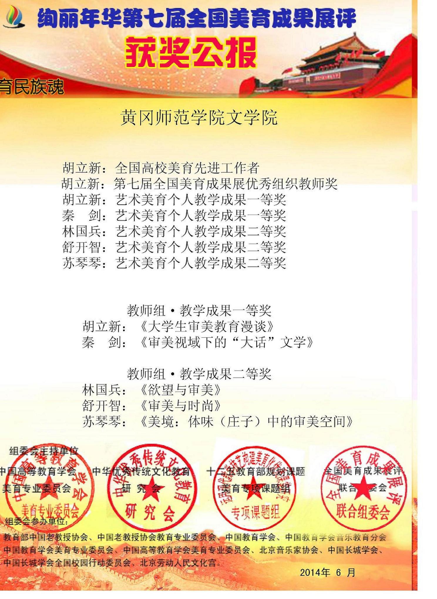 由中国美育网和中国高等教育学会美育专业委员会等联合发起举办的“美育民族魂第七届全国美育成果展评”近日揭晓,77779193永利官网胡立新教授荣获全国高校美育先进工作者暨第七届全国美育成果展优秀组织教师奖,其负责主持的视频公开课《大学生审美教育漫谈》获得教师组教学成果一等奖。秦剑老师主讲的《审美视域下的“大话”文学》获得艺术美育个人教学成果一等奖。林国兵老师主讲的《欲望与审美》、苏琴琴老师主讲的《美境:体味庄子中的审美空间》、舒开智老师主讲的《审美与时尚》等获得艺术美育个人教学成果二等奖。