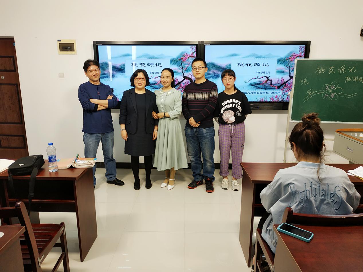 周老师以《桃花源记》为范文,开始教学示范。首先以一幅桃花的简笔画吸引在场同学的目光,通过发现桃源之美好,感受桃源之和谐,探究桃源之价值三部分内容对《桃花源记》进行了清晰生动的授课;课中从汉字的演变加强文言字词的理解记忆,从历史角度探讨桃花源是否存在使人耳目一新;课后,周老师就自己专业成长之路对同学们进行了讲解与鼓励。周老师亲切的气质,渊博的古典知识和富有吸引力的课堂教学,似春风化雨,令在坐师生倾服。最后,饶向阳老师通过另一个视角现场重新解读了《桃花源记》。丰建霞老师对此次讲座做了总结陈词,本次讲座圆满完成。