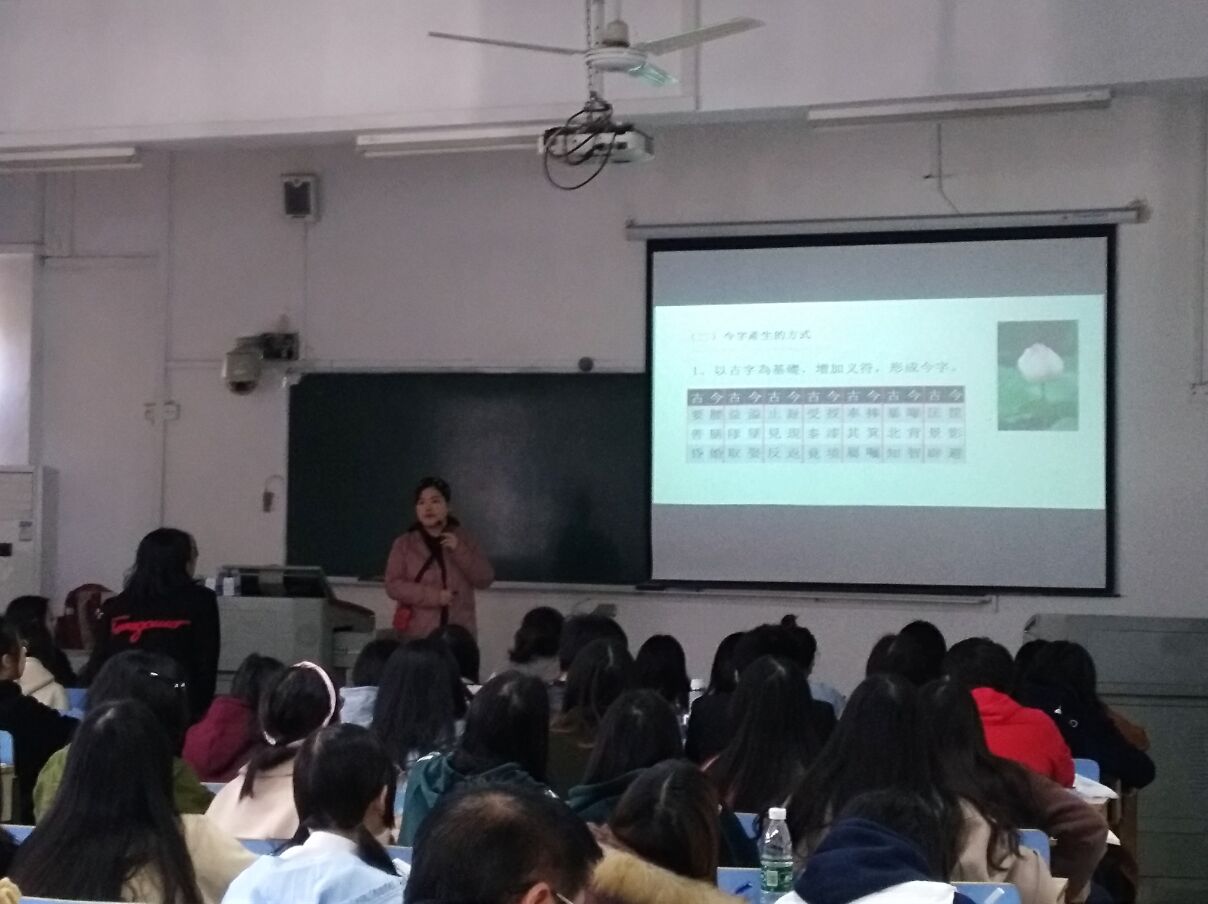 授课中,杨老师以提问方式引出今天的教学主题��古今字,激发起同学们思考和兴趣后,继而从形成古今字的原因、今字产生的方式和古字与今字的对应关系等方面循序渐进地展开教学内容。杨老师自然大方的教态,清晰标准的语言表达,整洁美观的课件使课堂较快地进入佳境,课堂实现了师生有效互动,气氛活跃。