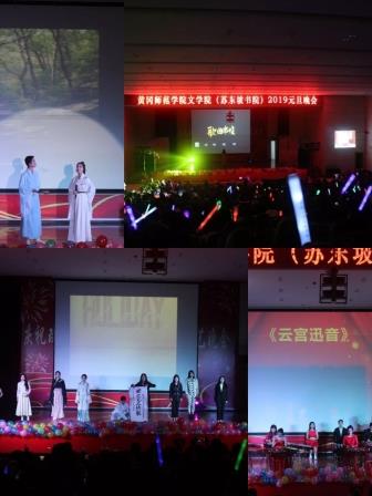 我院舞蹈队带来活力四射的开场舞迅速点燃现场气氛。接下来是大型诗朗诵节目《魅力黄师与你我同行》,该诗是胡立新书记为纪念改革开放40周年暨我校高师办学40周年而亲笔撰写,胡书记飞扬的文采与同学们激情的朗诵相得益彰;晴天话剧社带来老舍先生名作《茶馆》片段,展示了《茶馆》中的爱国情怀;蒋静老师的京剧《春秋亭》别有一番韵味;大学生民乐团带来《云宫迅音》,让我们仿佛又置身与《西游记》的取经场景。