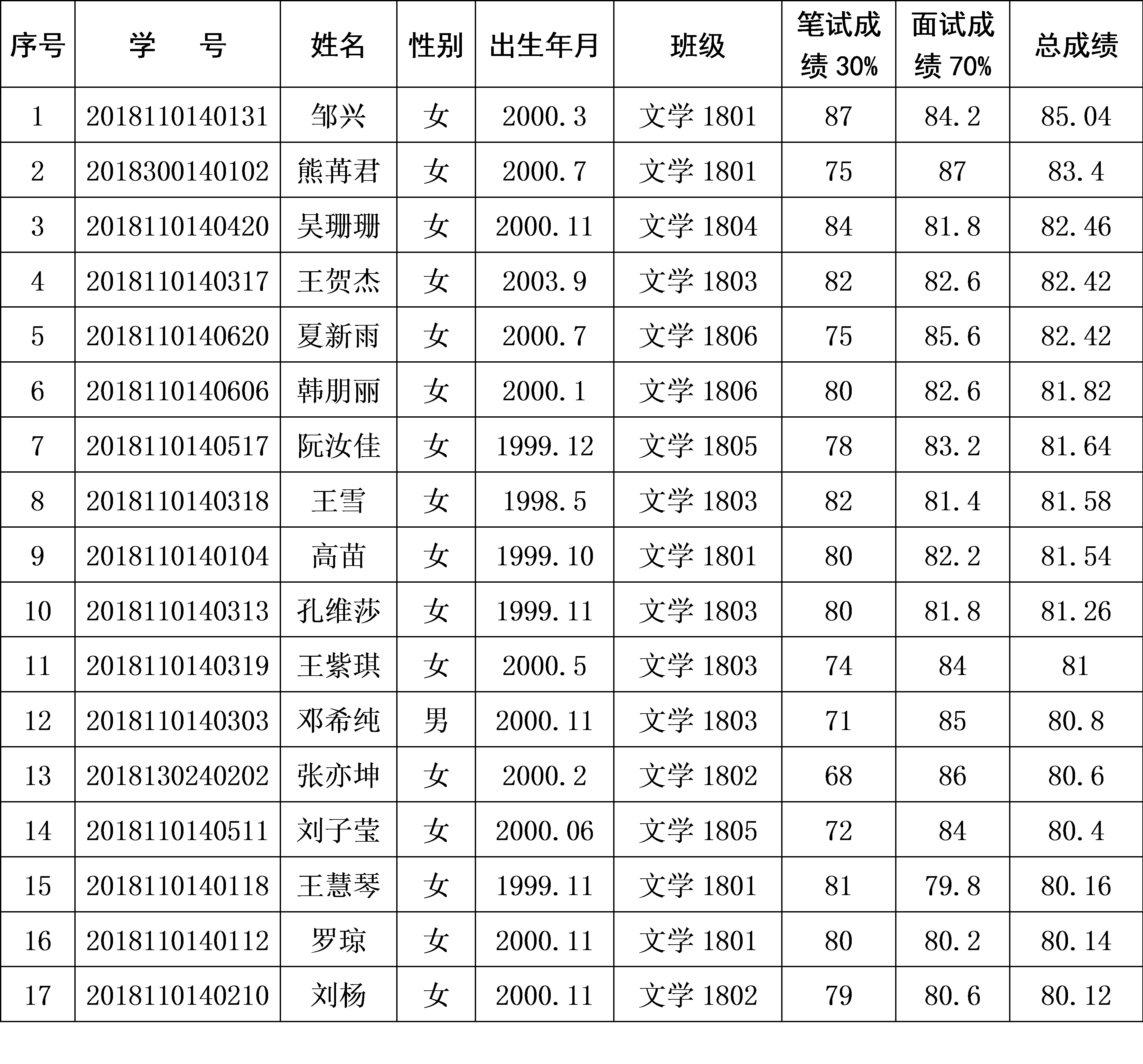 通过前期广泛升入的宣传动员,报名参加我院“东坡国学良师班”的汉语言文学专业2018级学生共有29人。经过笔试、面试等环节,本班拟录取17人,名单现已确定,公示如下: