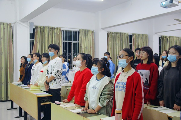 活动开始,全体成员起立并奏唱国歌、团歌,由李俊领誓重温入团宣誓词。