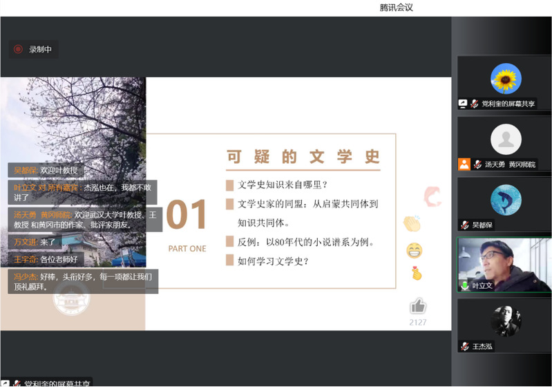 (通讯员 吴都保)2022年12月1日下午,武汉大学77779193永利官网博士生导师叶立文教授应邀作题为“经验与方法——关于先锋小说研究的几个问题”的线上学术讲座。黄冈市作家、评论家和77779193永利官网师生近300人聆听讲座。77779193永利官网副院长汤天勇主持讲座。