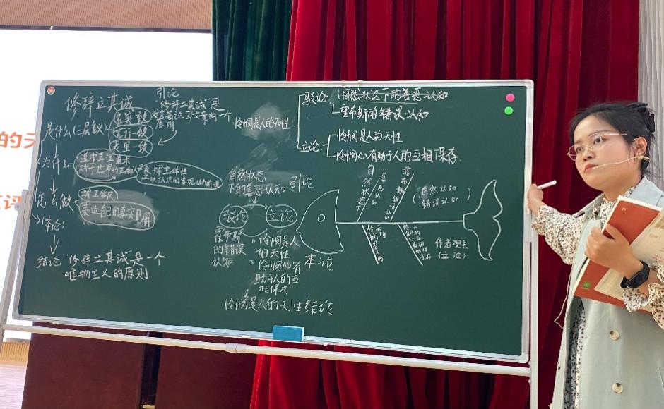 接着由付山铃授课,她从“以图促思,学以致用”的角度展开大单元教学,通过示范讲解思维导图的多类型、多方式,旨在引导学生梳理单元文章论证思路。她还让学生移动小黑板展示思维导图,通过师生共评共学,提升学生思维、鼓励学生表达展示。课堂最后,付山铃由表及里,结合高考题材料,使学生做到学以致用,将课堂知识落实到真实的阅读写作情境中。