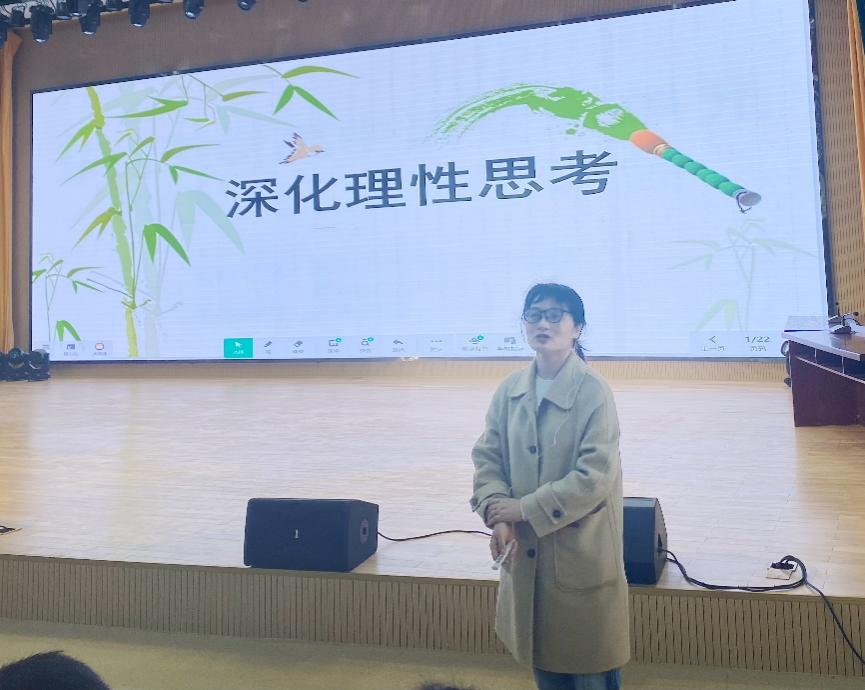 先由朱安平老师授课,她以“深化理性思考”为切入点,以思维导图的形式呈现,辐射全单元七篇课文。同时,朱老师从阅读走向写作,运用以读促写的方式,有梯度地训练学生地写作思维,由浅入深、循序渐进地达成教学目标。整个授课环节生动有趣、精彩纷呈,师生互动良好,学生思维活跃,创造了很好的课堂氛围。