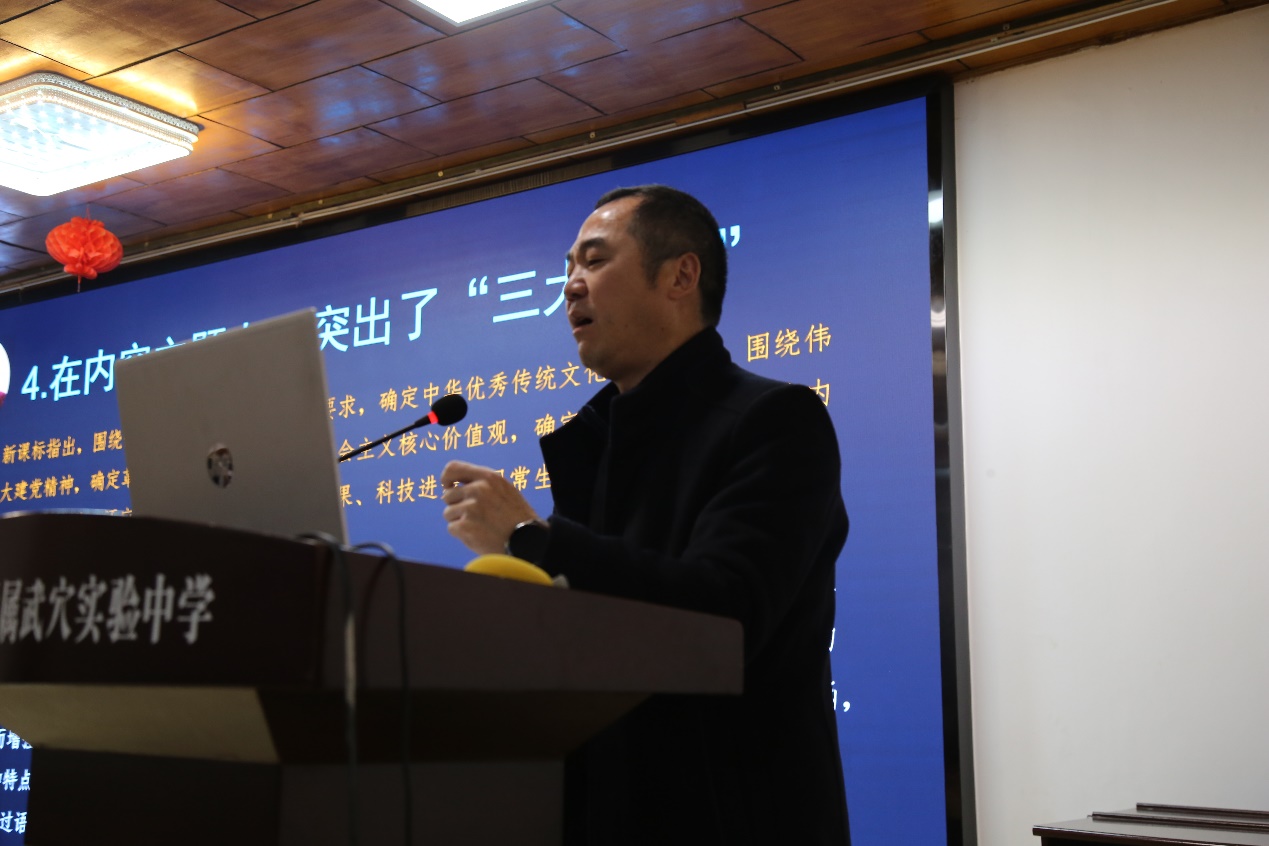 下午两点,会议第四项,我院邓军博士以“立足核心素养 聚焦学习任务”为题做了学术报告。邓博士从课改新动向、语文核心素养、教学实施思路和学业质量评价这四个部分进行阐述,提出语文教师在教学时,要立足核心素养,整体设计教学目标;以大概念为核心,聚焦若干情境任务;坚持过程与成果并重,综合运用多种评价方式。